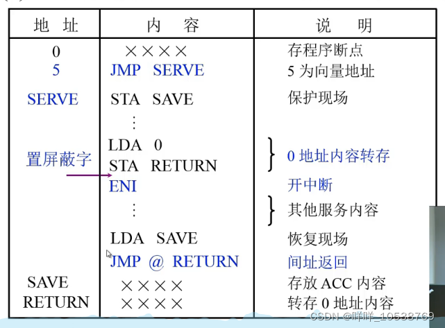 首先有一个断点内容存入0地址,SERVE是中断服务程序入口,将ACC寄存器内容保存在SAVE中保护现场,然后LDA进行取数操作,将地址为0的内存单元中的数【实际上就是断点】取出来也放入ACC寄存器,STA操作将断点保存在RETURN单元中,然后进行开中断操作,再恢复现场,即将SAVE中的内容再送回ACC中,然后JMP跳转指令跳到RETURN中刚才保存的那个地址上