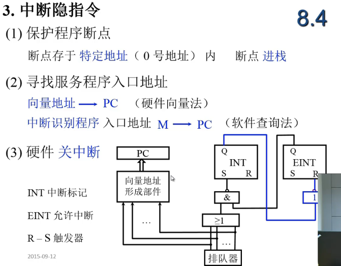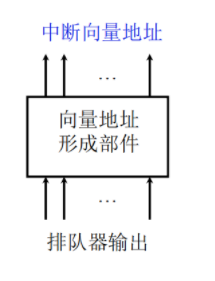 当EINT的输出为“1”且有中断请求时,并且下图的排球器输出的这么多信号中至少要有一个信号等于1,也就是说,当二者都为1时,才表示确实有中断请求提出并且要响应中断,那么通过s接口将INT也置为1,当INT变为1时,紧接着EINT就要马上变为0,然后将排队器输出的结果送给向量地址形成部件,这个向量地址再送给PC