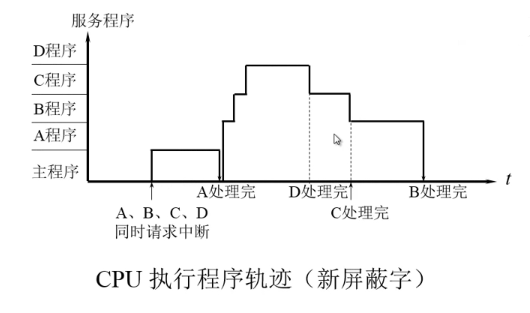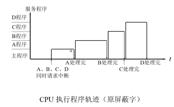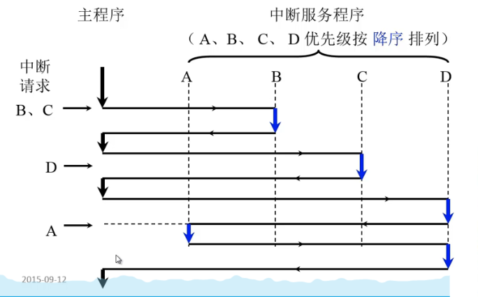 比如如下四个中断程序优先级按降序排列好,主程序发出两个中断请求B、C,因为B高于C,所以执行B的中断,执行完后B返回,返回到主程序时C还是在的,再继续响应C的中断,C正在执行的时候跑出来一个D,由于D优先级更低所以CPU此时不会理会D,等C执行完后才会执行D,在执行D的时候跑出来一个A,由于A的优先级高于D,所以程序会马上暂停D,去响应A的请求,而当A执行完后才会回去D继续执行刚才D未执行的部分,最终返回主程序