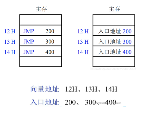 2、给出向量地址表,该表设在存储器内,那么存储单元的地址为向量地址,存储单元的地址为入口地址。只要访问向量地址所指示的存储单元,便可获得入口地址。