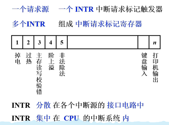 给每一个中断源设置一个触发器,用这个触发器来标记这个中断源是否提出了中断请求,一个中断源对应一个中断请求标志触发器,同理多个中断源就对应多个触发器,组成一个下图的中断请求标记寄存器