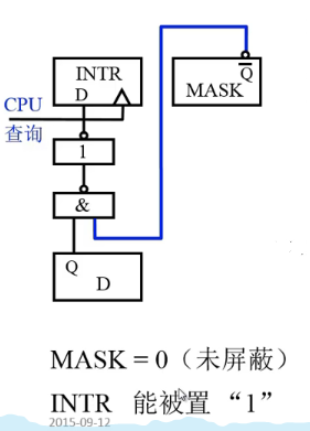 当Q=0时,没有屏蔽,且D的输出端与MASK的输出端都为1就可以在CPU查询的机制下提出中断请求,那么INTR输出端就会变为1,