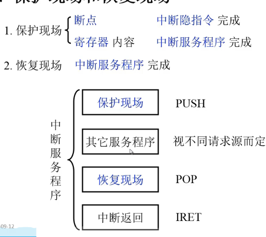 保护现场:应该包括保护程序断点和保护CPU内部各寄存器内容的现场两个方面。程序断点的现场由中断隐指令完成,各寄存器内的现场可在中断服务程序中由用户(或系统)用机器指令编程实现。