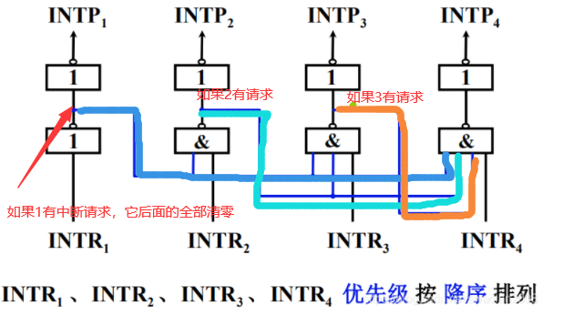 2、排队器设在CPU内,当最高优先级的中断源有请求时INTR1=1,就可封住比它优先级低的中断源的请求,如下图