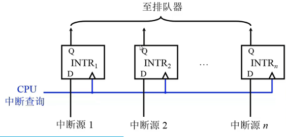 CPU的查询信号送到每一个中断源中的中断触发器,驱动触发器的输出端置为1,然后把中断请求信号发送到排队器