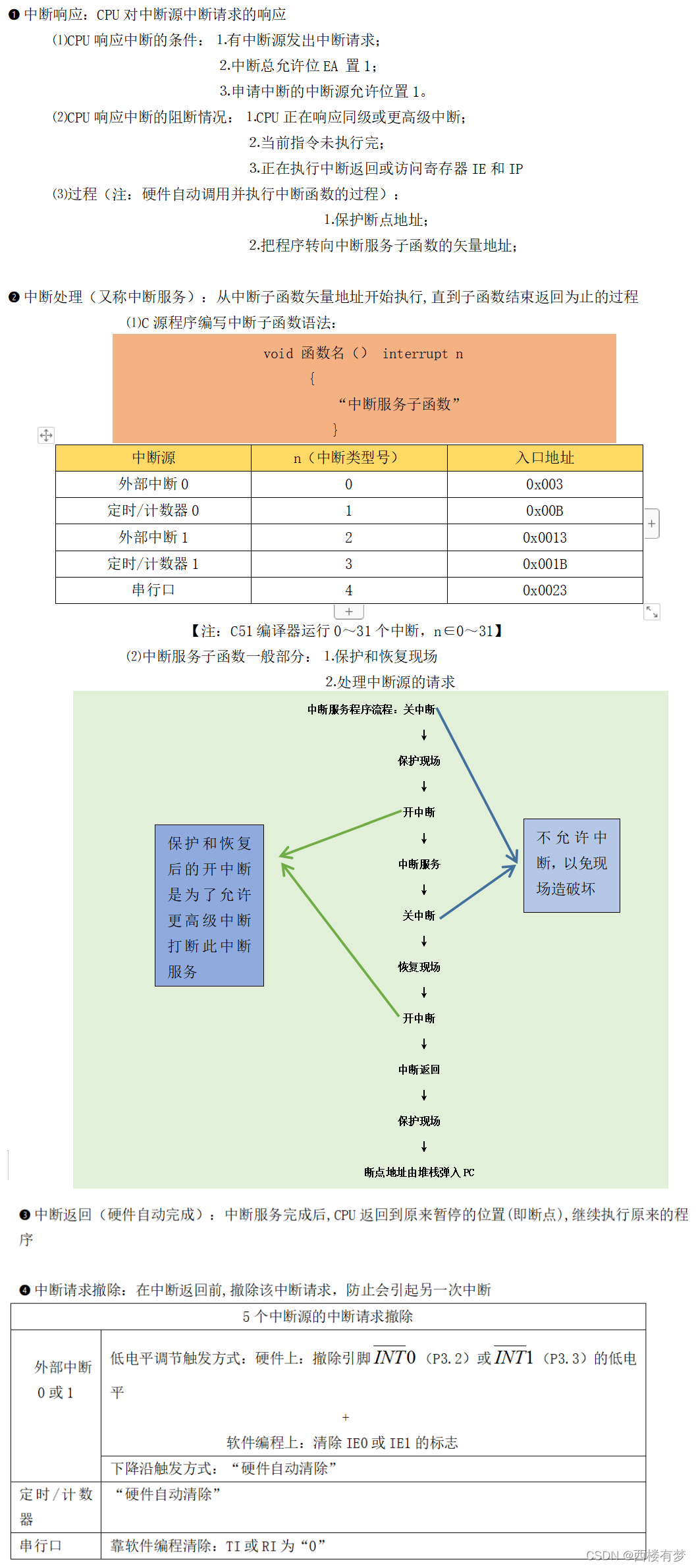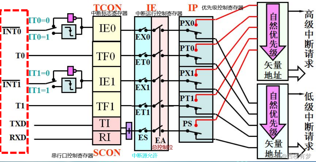 3.中断系统: ? ? ? ? ? ? ? ? ? ?①中断概念:通过硬件来改变CPU的运行方向 ? ? ? ? ? ? ? ? ? ?②中断流程:?? ? ? ? ? ? ? ? ? ? ?③中断源:能发出中断请求信号的各种事件(l/0设备、定时时钟、系统故障、软件设 ???????????????????????????????????????????????????????????????????????????????????????????定) ? ? ? ? ? ? ? ? ? ?④传统51单片机中断资源(3类共5个中断源【注:STC89C52有8个】): ? ? ? ? ? ? ? ? ? ? ? ? ? ? ? ??外中断2个:INTO、INT1【由引脚INTO (P3.2)和INT1 (P3.3)引入】 ? ? ? ? ? ? ? ? ? ? ? ? ? ? ? ??定时中断2个:T0、T1【无引入端,请求在芯片内部发生,以记数溢出信号作 ? ? ? ? ? ? ? ? ? ? ? ? ? ? ? ? ? ? ? ? ? ? ? ? ? ? ? ? ? ? ? ? ? ? ? ?为中断请求,去置位一个溢出标志位】 ? ? ? ? ? ? ? ? ? ? ? ? ? ? ? ??串行中断1个:RI/TI【无引入端,请求在芯片内部发生。接收或发送完一帧串 ??????????????????????????????????????????????????????????????????行数据时,就产生一个中断请求。】 ? ? ? ? ? ? ? ? ? ?⑤传统51单片机中断优先级:?目的:为中断嵌套服务 ? ? ? ? ? ? ? ? ? ? ? ? ? ? ? ? ? ? ? ? ? ? ? ? ? ? ? ? ? ? ? ? ? ?2级优先级【注:STC89C52有4级】 ? ? ? ? ? ? ? ? ? ? ? ? ? ? ? ? ? ? ? ? ? ? ? ? ? ? ? ? ? ? ? ? ???被控制对象:中断优先寄存器IP(0XB8) ? ? ? ? ? ? ? ? ? ? ? ? ? ? ? ? ? ? ? ? ? ? ? ? ? ? ? ? ? ? ? ? ???原则:㈠高级先与低级,高级可打断低级而低级不可? ? ? ? ? ? ? ? ? ? ? ? ? ? ? ? ? ? ? ? ? ? ? ? ? ? ? ? ? ? ? ? ? ? ? ? ? ? ? ? ? ? ? ?打断高级 ? ? ? ? ? ? ? ? ? ? ? ? ? ? ? ? ? ? ? ? ? ? ? ? ? ? ? ? ? ? ? ? ? ? ? ? ? ? ? ?㈡如果一个中断请求已被响应,则同级的其它中 ? ? ? ? ? ? ? ? ? ? ? ? ? ? ? ? ? ? ? ? ? ? ? ? ? ? ? ? ? ? ? ? ? ? ? ? ? ? ? ? ? ?断服务将被禁止。即同级中断不能嵌套 ? ? ? ? ? ? ? ? ? ? ? ? ? ? ? ? ? ? ? ? ? ? ? ? ? ? ? ? ? ? ? ? ? ? ? ? ? ? ? ?㈢如同级的多个中断请求同时出现,则按CPU查 ? ? ? ? ? ? ? ? ? ? ? ? ? ? ? ? ? ? ? ? ? ? ? ? ? ? ? ? ? ? ? ? ? ? ? ? ? ? ? ? ???询次序确定哪个中断请求被响应。 ???????????????????????????????????????????????????????????????????????????????????? ? 查询次序为:INT0(外部中断0) ????????????????????????????????????????????????????????????????????????????????????????????????????????????????↓ ? ? ? ? ? ? ? ? ? ? ? ? ? ? ? ? ? ? ? ? ? ? ? ? ? ? ? ? ? ? ? ? ? ? ? ? ? ? ? ? ? ? ? ? ? ? ? ? ? ? ? ? ? ? ? T0(定时器T0中断) ????????????????????????????????????????????????????????????????????????????????????????????????????????????????↓ ? ? ? ? ? ? ? ? ? ? ? ? ? ? ? ? ? ? ? ? ? ? ? ? ? ? ? ? ? ? ? ? ? ? ? ? ? ? ? ? ? ? ? ? ? ? ? ? ? ? ? ? ? ? ? INT1(外部中断1) ????????????????????????????????????????????????????????????????????????????????????????????????????????????????↓ ? ? ? ? ? ? ? ? ? ? ? ? ? ? ? ? ? ? ? ? ? ? ? ? ? ? ? ? ? ? ? ? ? ? ? ? ? ? ? ? ? ? ? ? ? ? ? ? ? ? ? ? ? ? ? T1(定时器T1中断) ????????????????????????????????????????????????????????????????????????????????????????????????????????????????↓ ? ? ? ? ? ? ? ? ? ? ? ? ? ? ? ? ? ? ? ? ? ? ? ? ? ? ? ? ? ? ? ? ? ? ? ? ? ? ? ? ? ? ? ? ? ? ? ? ? ? ? ? ? ? ? RI/TI(串口中断) ? ? ? ? ? ? ? ? ? ?⑥传统51单片机中断系统的结构: ????????????????? ? ? ? ? ? ? ? ? ? ? ? ? ? ? ?? ? ? ? ? ? ? ? ? ? ? ? ? ? ? ? ? ? ? ? ? ? ? ? ? ? ?(注:TI和RI虽为两个中断请求, ??????????????????????????????????????????????????????????????但信号通过或门后进入中断系统, ??????????????????????????????????????????????????????????????故是一个中断源) ? ? ? ? ? ? ? ? ? ?⑦51单片机中断处理过程: