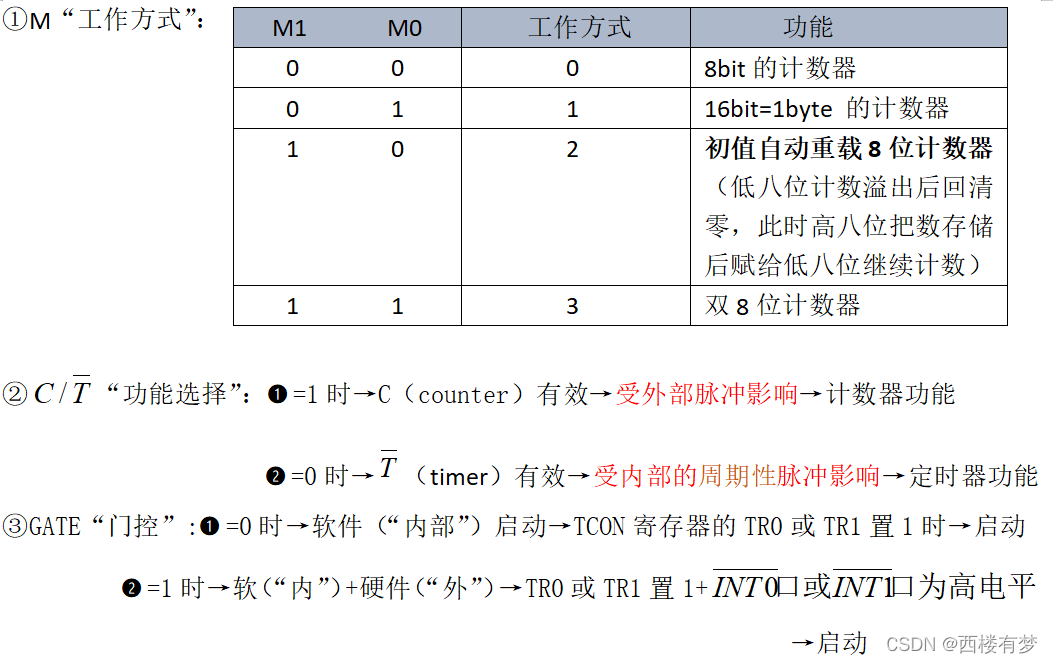 (1)工作方式寄存器TMOD(“T”imer “Mod”e Control Register):