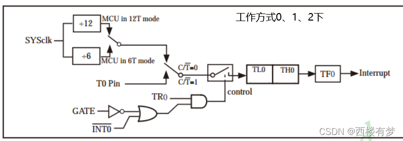 2.定时/计数器的结构及逻辑电路(注:单片机通过配置寄存器完成内部线路的连通):