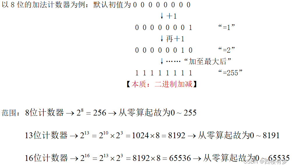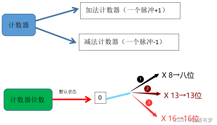 1.定时器/计数器: ? ? ? ? ? ? ? ? ?①作用:?用于计时系统,可实现软件计时、使程序每个一固定时间(“相比软件计时更 ? ? ? ? ? ? ? ? ? ? ? ? ? ? ? ? ? 精准”)完成一项操作; ? ? ? ? ? ? ? ? ? ? ? ? ? ? ? ??替代“长时间的延时函数”,提高CPU的运行效率和处理速度(“相互独立,各 ? ? ? ? ? ? ? ? ? ? ? ? ? ? ? ? ? 干各”) ????????????????????????????????????????????????(被占用现象举例:流水灯在delay时,此时按键检测的delay被占用 ? ? ? ? ? ? ? ? ? ? ? ? ? ? ? ? ? ? ? ? ? ? ? ? ? ? ? ? ? ? ? ? ? ? ? ? ? ? ? ? 无法实现【CPU一条一条执行】,造成按键检 ????????????????????????????????????????????????????????????????????????????????测不灵敏现象。) ????????????????????????????????…… ? ? ? ? ? ? ? ?? ②STC89C52的定时器/计数器资源:?属于内部资源,其电路的连接和运转均在内部完 ??????????????????????????????????????????????????????????????????????????????成(注:单片机通过配置寄存器完成内部线路的 ?????????????????????????????????????????????????????????????????????????????????????????????连通); ????????????????????????????????????????????????????????????????????????????有3个(T0、T1、T2),T0和T1与传统的51单 ??????????????????????????????????????????????????????????????????????????????片机兼容,T2是此型号单片机增加的资源。 ??????????????????????????????????????????????????????????????????????????????????????????????(注:不同型号的单片机定时资源与操 ? ? ? ? ? ? ? ? ? ? ? ? ? ? ? ? ? ? ? ? ? ? ? ? ? ? ? ? ? ? ? ? ? ? ? ? ? ? ? ? ? ? ? ? ? ? ? ? ? ? ? ? ?作可能有不同。一般T0、T1的 ?????????????????????????????????????????????????????????????????????????????????????????????????????????操作方式在51单片机中通用) ?????????????????③分类与位数和范围: ? ? ? ? ? ? ? ? ? ? ? ? ? ? ? ? ? ? ? ? ? ? ? ? ? ? ? ? ? ? ? ? ? ? ? ? ? ? ? ? ? ? ? ? ? ? ? ? ? ? ? ?