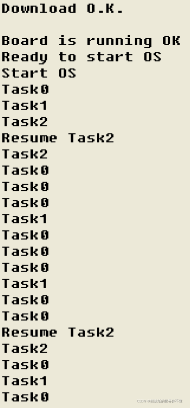 程序中创建了四个任务,任务0 每1 秒运行一次,任务1 每3 秒运行一次,任务2 运 行一次即把自己挂起,任务3每8秒运行一次并把任务2恢复。