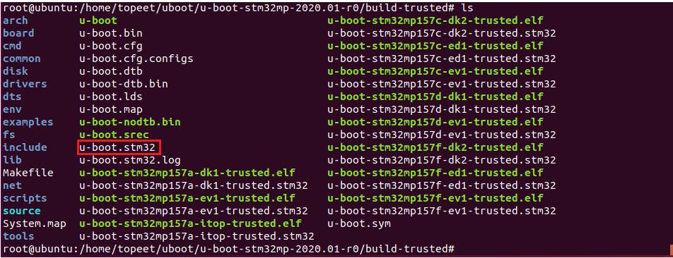 编译完成之后会在上一级目录产生 build-trusted 目录,用来存放编译生成的文件。而我们所需要的文件为 u-boot.stm32 如下图所示: