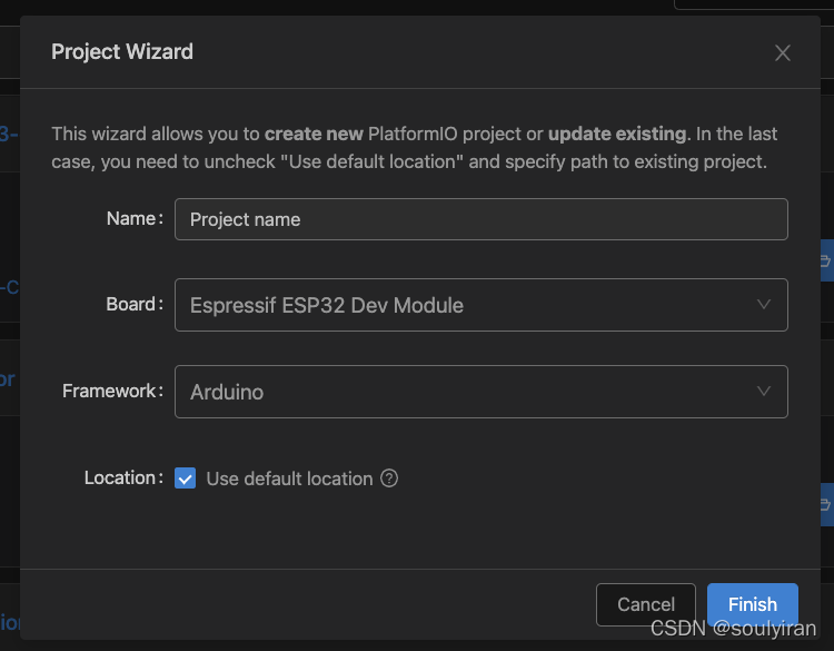 首先新建工程,开发板选择ESP32 Dev,选择创建位置后,创建工程。首次创建可能速度较慢,使用代理会明显提升。