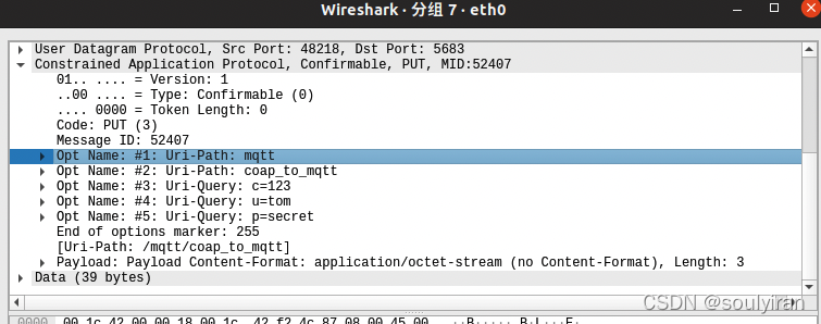 其中在抓包数据中可以看到,路径信息"/mqtt/coap_to_mqtt"以及clintID以及连接账户密码等配置是以CoAP Options形式发送的,因此需要额外配置。