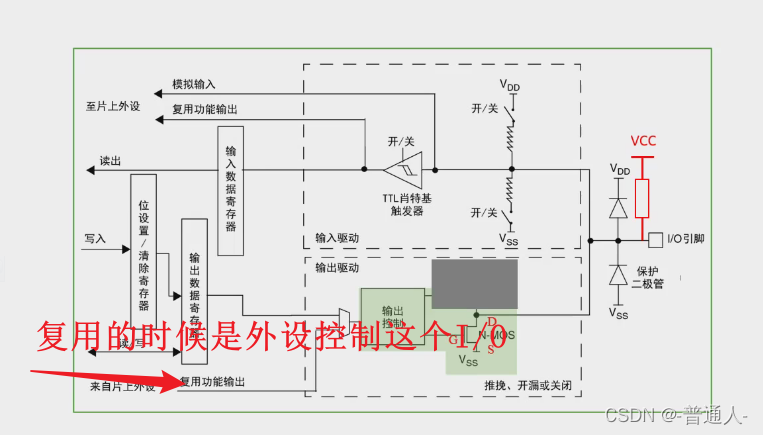 输入模拟模式 绕过肖特基二极管(整理波形的作用),直接读取I/O口电平。 -