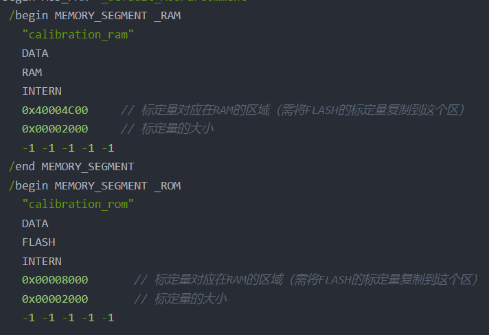 - 其中标定量是存储在FLASH中,运行在RAM里,需要在RAM和ROM里规定一块相同大小的区域,我用的是KEIL,如何将变量规定到指定的存储区域和运行区域,需要修改sct分散加载文件,SCT文件相关内容可以看野火大师篇