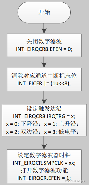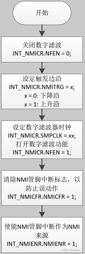 下面流程图以 NMI 管脚中断为例,给出了配置流程。 ?