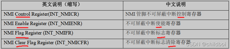 ?至此, NMI 管脚中断的相关配置结束,如需使用 NMI 管脚中断功能,还需要配置中断选择寄存器以及 NVIC 部分,这部分配置说明将在中断源选择章节进行详细讲解。