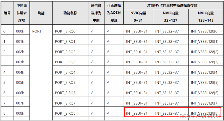 下面同样以外部管脚中断 8 为例,对中断选择寄存器进行说明。 配置中断选择寄存器前,先查询芯片手册的 12.3.2 中断事件请求序号章节,获取欲配置的中断事件序号,下图摘抄至手册此章节。