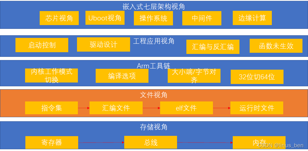 ? ? ? ? ?如上图所示,是不同视角下的arm体系结构,存储的视角下,arm涉及到寄存器、总线和内存三个不同的角色,这是软件存储和执行的基础。文件视角下,在不同的阶段,arm会以不同的文件形式存在,arm最基本的构成元素是指令,这些指令通过不同的组合方式构成汇编文件,汇编文件经过编译生成elf文件,cpu就可以加载elf文件在寄存器中运行。arm工具链是将arm文件编译成arm核可以识别的文件的一套工具,在我们日常开发写makefile和build文件时接触到的arm最多的部分,其中涉及到编译工具链、编译选项、字节序等等。工程应用视角下系统的第一阶段的启动,引导初始化cpu,在问题定位时的反汇编定位法,在日常调试中的函数未定义问题的定位,这些都需要arm的基本知识做基础。在嵌入式七层架构的视角,笔者将从芯片、uboot、操作系统、中间件到最终的边缘计算,分别去总结其中涉及到的跟arm体系结构相关的知识,特别是边缘计算作为一种新的计算方式,现有的arm体系架构能否支撑,今年即将正式发布的armv9指令集将对边缘计算带来哪些机会和挑战,将是笔者重点探讨的方向。