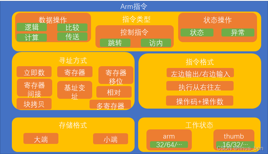 ? ? ? ? 图中列举了一条最简单的指令ADD R0,R1,R2,实现的功能将R1和R2两个寄存器求和,然后将结果保存在寄存器R0中。指令在执行过程中,按照从右往左的顺序依次取值,并将最终的计算结果存放在最左边的寄存器上,这样的执行过程也是适用于大多数的指令执行过程。再进一步深探这条指令,就需要知道指令中每个操作码或者操作数的长度,这部分属于arm指令集中的工作状态部分,有arm和thumb两种工作状态,对应的指令长度分别是32/64位和16/32位,相互之间可以进行切换,我们日常编码中经常会听到要4字节对齐或者8字节对齐,可以提升代码性能,就是来源于该工作状态,除此以外在arm更新换代中,往往要兼容新老设备,也要注意32位和64位系统在编码、编译上的差异。从指令存储格式上看,当前主要有大端序和小端序两种存储格式,所谓大端序即高位存在低地址的地方,低位存在高地址的地方,小端序则是低位存在低地址的地方,高位存在高地址的地方,字节序的转换也是网络应用开发中经常会遇到的,就是跟指令的这个大小端的存储有关。至此这样一条arm指令我们就解读完成,笔者将上面一条指令中所包含的关键构件放到上图的左边,即arm指令中,其中包含指令类型、寻址方式、指令格式、存储格式和工作状态5个基本组件。下图进一步将这5个基本组件的内部构成细分,勾勒出一张相对完整的arm指令地图,无论指令集的版本如何演进,该图中的基本概念是不变的,这张图将会伴随笔者后续解读汇编文件。
