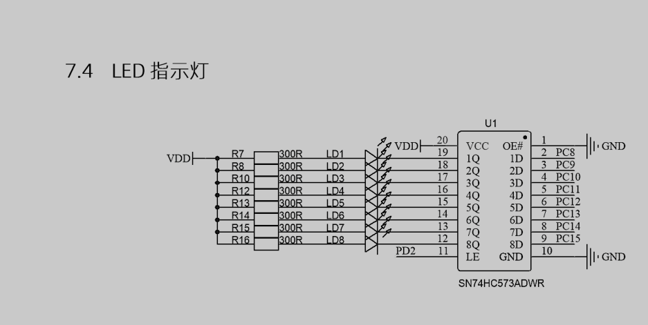 还是比较可以锻炼能力的,所以说点灯比较容易,就一笔带过,还有的一个是,这里的LED灯使用了一块SN74HC573ADWR的芯片,我们要考虑一下他与LCD的兼容性,这里如何解决兼容的问题,以后再说。