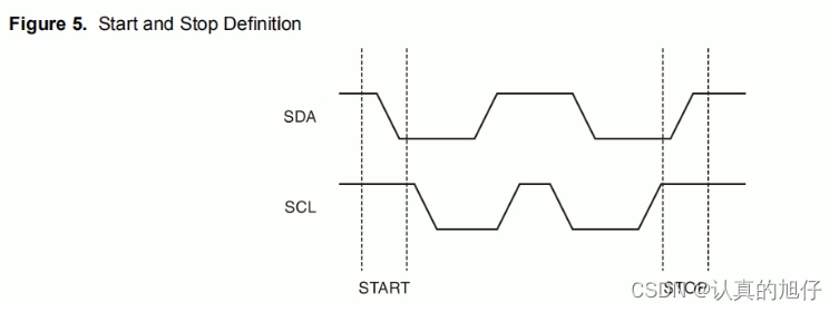 ????????SDA:双向传输,SCL为高时,若SDA数据改变,则视为起始信号或停止信号(如下图)