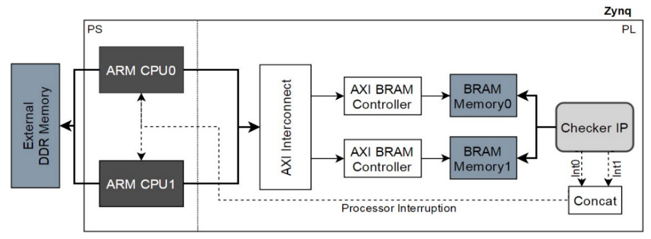 文中提出的ARM双核lockstep架构如下图所示,该架构中有两个CPU、两个BRAM、一个checker和一个DDR Memory。为了防止两个CPU同时竞争DDR中的资源,每个CPU均配置了一个最大64KB大小的BRAM。