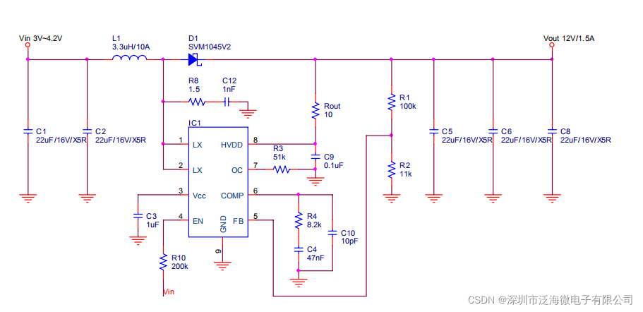??C1,C2,C5,C6,C8:输入与输出稳压滤波电容。 ??C9:HVDD?滤波电容。 ??C3:HVDD?经过內部稳压管到?Vcc?产生?5V,此电压会提供內部电路与驱动?MOS,需要加稳压电容。 ??C4,C10,R4:系统补偿回路元件,关系到?LX?方波稳定度与暂态响应速度。 ??R1,R2:FB?分压电阻,決定输出电压,R1?使用300k?~500k?。 ??R3:改变阻值,调整过电流保护点。 ??R10:EN?到输入上拉电阻,控制?EN?下拉地,开关?IC。 ??Rout:HVDD?限流电阻,避免输出电压过高,击伤?IC。 ??C12,R8:突波吸收元件,降低?LX?开关切换突波。 ??L1:电感具有储能与滤波功用,感值越大电流涟波越小,相对感值越小涟波越大。选用电感注意电感是否适合高频操作,及电感额定饱和电流值。 ??D1:当?LX?截止时,D1?肖特基管导通,提供电感放电回路 - PCB布局说明