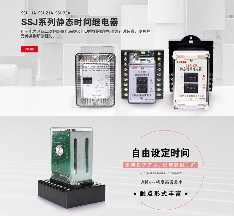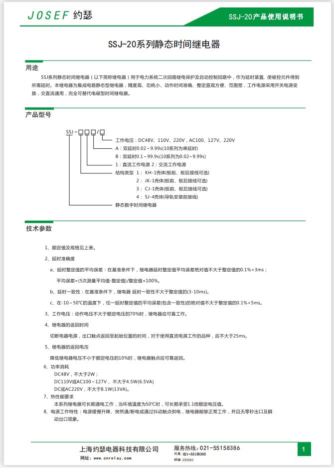 品牌:上海约瑟 名称:静态时间继电器 型号:SSJ-11A;SSJ-21A;SSJ-32A 工作电压:48,110,220VDC/100,127,220VAC 返回时间:≤25mS 延时范围:0.02~99.9S 触点容量:250V5A 功率消耗:≤8.1W 系列型号: SSJ-10A系列静态时间继电器;SSJ8-11A系列高精度时间继电器; SSJ-11A静态时间继电器;SSJ-12A静态时间继电器; SSJ-11B静态时间继电器;SSJ-21B静态时间继电器 SSJ-21A静态时间继电器;SSJ-22A静态时间继电器 SSJ-22B静态时间继电器SSJ-42B静态时间继电器 SSJ-42A静态时间继电器SSJ-41A静态时间继电器 SSJ-41B静态时间继电器SSJ-32B静态时间继电器 SSJ-32A静态时间继电器SSJ-31A静态时间继电器 SSJ-31B静态时间继电器 SSJ8-12A高精度时间继电器;SSJ-78A/T1时间继电器; SSJ-78B/T1时间继电器;SSJ-78C/T1时间继电器; SSJ-78A/T2时间继电器;SSJ-78B/T2时间继电器; SSJ-78C/T2时间继电器;SSJ-79A/T1时间继电器; SSJ-79B/T1时间继电器;SSJ-79C/T1时间继电器; SSJ-79A/T2时间继电器;SSJ-79B/T2时间继电器; SSJ-79C/T2时间继电器;SSJ-78AD/T1大功率时间继电器; SSJ-78BD/T1大功率时间继电器;SSJ-78CD/T1大功率时间继电器; SSJ-78AD/T2大功率时间继电器;SSJ-78BD/T2大功率时间继电器; SSJ-78CD/T2大功率时间继电器;SSJ-79AD/T1大功率时间继电器; SSJ-79BD/T1大功率时间继电器;SSJ-79CD/T1大功率时间继电器; SSJ-79AD/T2大功率时间继电器;SSJ-79BD/T2大功率时间继电器; SSJ-79CD/T2大功率时间继电器; 一、概述 时间继电器SSJ-22B/DC220V/0.1s-99.9s(以下简称继电器)用于电力系统二次回路继电器保护及自动控制回路中,作为延时装置,使被控元 件得到所需延时。本继电器为集成电路静态型继电器,精度高、功耗小、动作时间准确、整定直观方便、范围宽,工作电源采用 电源变换,交直流通用,完全可替代电磁型时间继电器。 上海约瑟继电器事业部