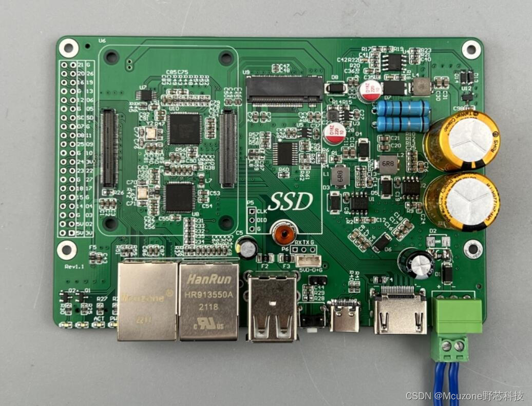 硬件资源介绍: 1,7-28V DC输入。主电源和超级电容充电电路相互独立,均可支持5V3A负载; 2,标准尺寸HDMI输出,支持4K; 3,原生千兆; 4,USB2.0扩展的百兆,可选工业级; 5,USB2.0 Hub,可选工业级; 6,两个USB2.0主机接口,内部预留一个1.25T 4pin接口可扩展4G模组; 7,M.2接口NVME协议SSD固态盘,2242尺寸; 8,2个系统状态指示灯,2个用户指示灯; 9,板载MCU进行供电逻辑管理的UPS电路,标配2个22F超级电容,可续航20-40秒。支持CM4关机后外部电源来电重启; 10,40pin标准扩展接口; 11,CM4可通过GPIO监测到外部电源转换而来的5V电源状态; 12,板载低电压监测芯片,当超级电容放电至2.4V(可定制关机门限)时关闭电源,确保不出现跳闪情况;13,支持TF启动(位于反面),也支持从eMMC启动(此时TF卡槽不能插卡),并可通过USB-C接口烧写eMMC版本CM4核心板; 14,一路GPIO按键; 15,用于UPS管理的MCU预留有串口,可进一步丰富和CM4的交互内容(如读取超级电容电压,需定制);