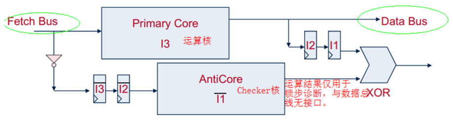 - 时间上,Primary Core先取指,运算结束后延时两个CPU clock时间,再传给Compare单元,Checker Core延时两个CPU clock时间后取指令,运算结束后传给Compare单元;
