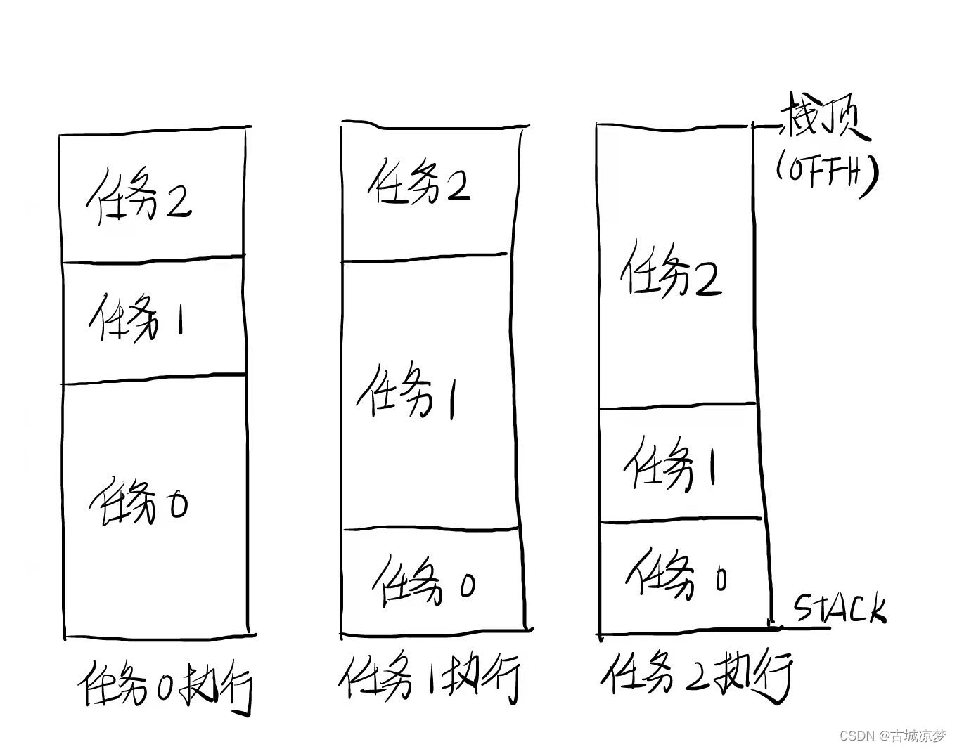 RTX51 Tiny仅使用8051的内部内存(IDATA)为每个任务维护一个堆栈。当一个任务正在运行时,它会被赋予尽可能多的堆栈空间。当任务切换发生时,前一个任务堆栈会收缩并重新定位,当前任务的堆栈则会扩展并重新定位。