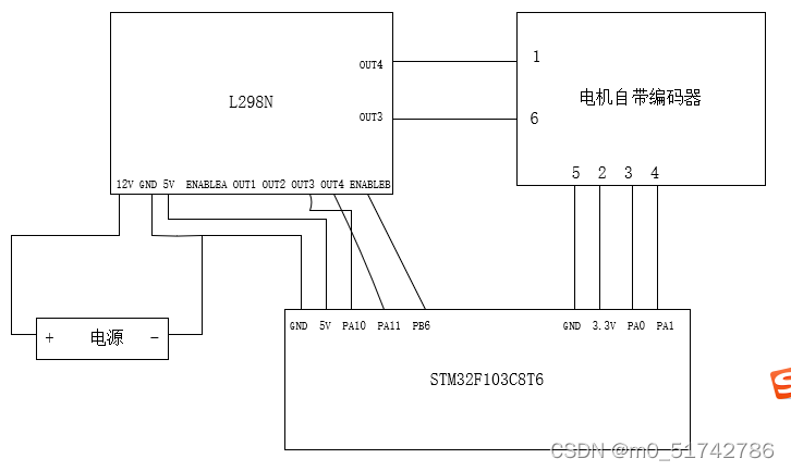 由于资源有限,人也比较懒,目前只实现了一个电机的控速,想着需要的时候,薅过去就能直接用,因为设想中是要控制俩编码器电机的,所以代码中会看到有些引脚配置了,但却没有在接线图中看到,直接忽略只看用到了的就好。