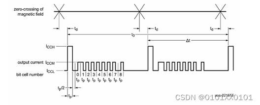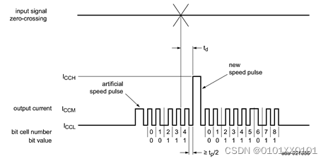 ????????当传感器检测到过齿,延时t_d(70~121us)后输出一个速度脉冲,脉冲宽度为t_p(通常为50us)。速度脉冲后面是数据协议位,最多有9个的数据单元。每个数据单元表示1位数据,所占时长为t_p。在速度脉冲和数据协议位的第一个数据单元之间存在t_p/2的时间间隔。