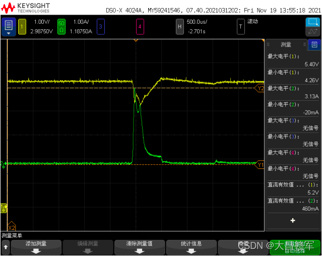大昌接手的某硬件产品,上电时大电流,直接拉黑供电设备,供电设备重启,波形如下:  黄色为供电5V,绿色为输入电流,如图可见瞬时大电流高达3.13A