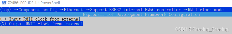 ? ? ? ? LAN8720A所处于的模式是REF_CLK_IN模式,所以需要由esp32输出来提供50MHz时钟驱动网络芯片,因此配置完下面后,重新烧录代码就成功运行了。