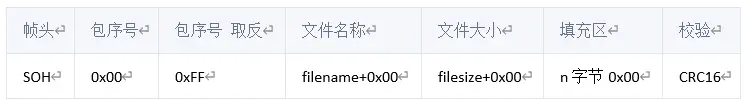 1.2??YMODEM起始帧 YMODEM起始帧并不直接传输文件内容,而是先将文件名和文件大小置于数据帧中传输;起始帧是以SOH 133字节长度帧传输,格式如下: