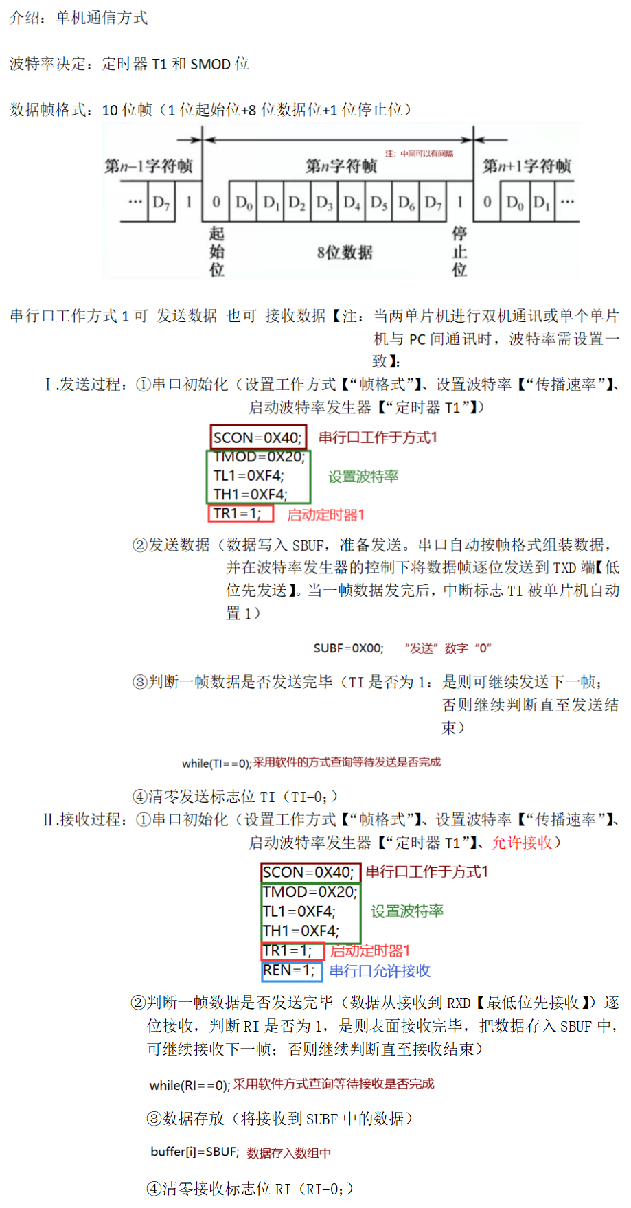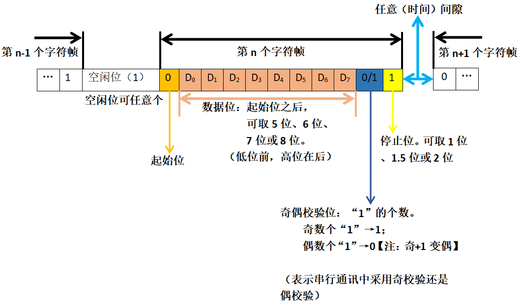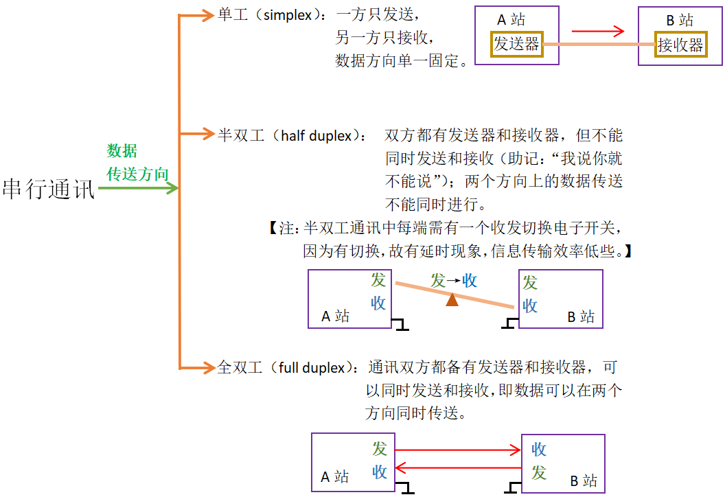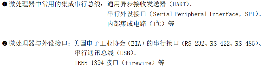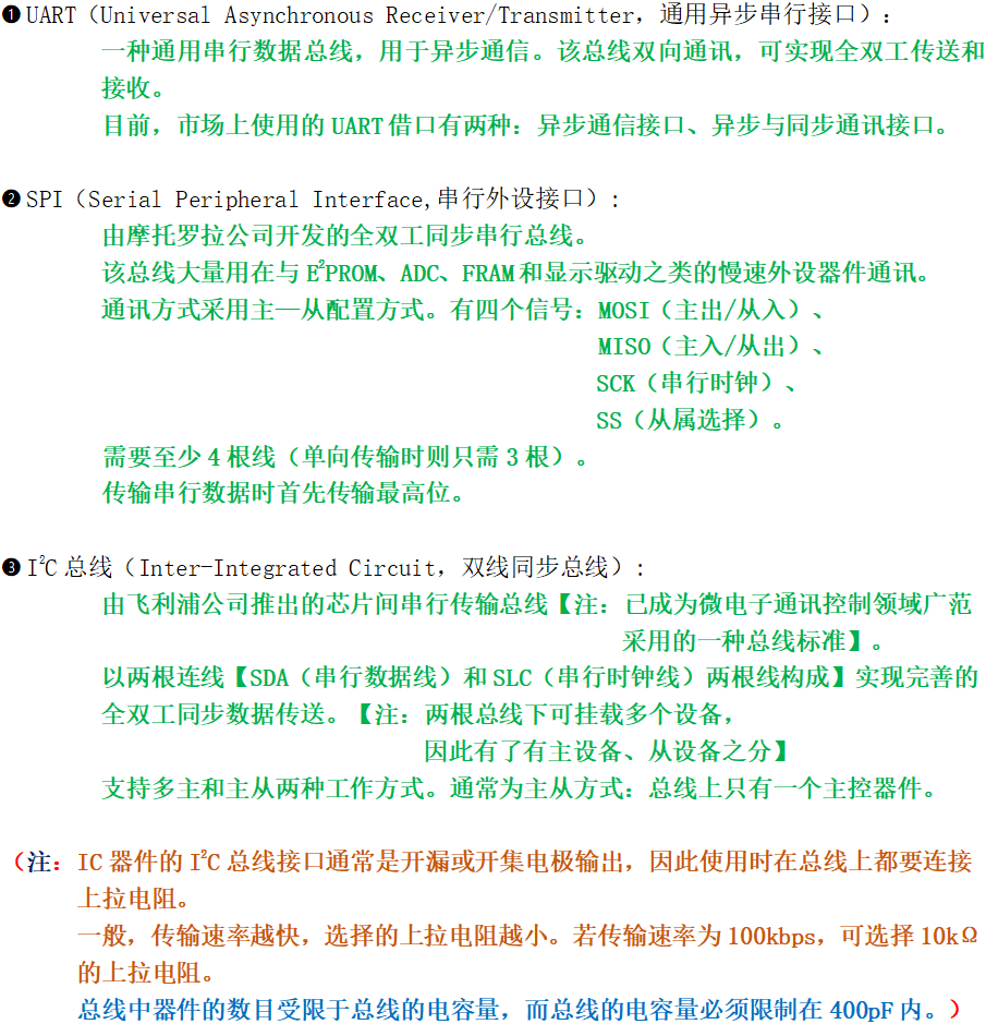 ? ? ? ? ? ? ? ? ? ? ? ? ? ④异步通讯与同步通讯(串行通讯按串行数据的时钟方式分类): ???????????????????????????????(1)异步通讯:通信中的发送端和接收端,使用各自的时钟控制数据的发送 ? ? ? ? ? ? ? ? ? ? ? ? ? ? ? ? ? ? ? ? ? ? ? ? ? ? ? ? ? 和接收。(“各自约定通讯速率”) ? ? ? ? ? ? ? ? ? ? ? ? ? ? ? ? ? ? ? ? ? ? ? ? ? ? ? ? ? 过程中,两个字符帧(以字符为单位组成)之间的时间间隔是 ? ? ? ? ? ? ? ? ? ? ? ? ? ? ? ? ? ? ? ? ? ? ? ? ? ? ? ? ? 不固定的,而在同一个字符帧内各位的时间间隔是固定的。 ? ? ? ? ? ? ? ? ? ? ? ? ? ? ? ? ? ? ? ? ? ? ? ? ? ? ? ? ? ? ? ? ?【注:发送端和接收端的时钟控制各自独立,互不同步, ? ? ? ? ? ? ? ? ? ? ? ? ? ? ? ? ? ? ? ? ? ? ? ? ? ? ? ? ? ? ? ? ? ? ? ? ? ??但时钟需尽可能一致以便协调】 ? ? ? ? ? ? ? ? ? ? ? ? ? ? ? ? ? ? ? ???缺点:因位功能的占用、间隙存在使传输效率较有降低 ?????????????????????????????????????????字符帧(又称:数据帧):起始位+数据位+奇偶校验位+停止位 ? ? ? ? ? ? ? ? ? ? ? ? ? ? ? ? ? ? ? ? ? ? ? ? ? ? ? ? ? ? ? ? ? ? ? ? ? ? ? ? ? ? ? ? ? 【注:奇偶校验规则:采用数据位后面补码的方式。 ? ? ? ? ? ? ? ? ? ? ? ? ? ? ? ? ? ? ? ? ? ? ? ? ? ? ? ? ? ?当通讯双方约定为奇校验时,若数据位有奇数个“1”,则补码 ? ? ? ? ? ? ? ? ? ? ? ? ? ? ? ? ? ? ? ? ? ? ? ? ? ? ? ? ? ?为“0”;若数据位有偶数个“1”,补码为“1”以凑齐奇数个 ? ? ? ? ? ? ? ? ? ? ? ? ? ? ? ? ? ? ? ? ? ? ? ? ? ? ? ? ? ?“1”。 ? ? ? ? ? ? ? ? ? ? ? ? ? ? ? ? ? ? ? ? ? ? ? ? ? ? ? ? ? ?当通讯双方约定为偶校验时,若数据位有奇数个“1”,则补码 ? ? ? ? ? ? ? ? ? ? ? ? ? ? ? ? ? ? ? ? ? ? ? ? ? ? ? ? ? ?为“1”以凑齐偶数个“1”;若数据位有偶数个“1”,补码为“0”以 ? ? ? ? ? ? ? ? ? ? ? ? ? ? ? ? ? ? ? ? ? ? ? ? ? ? ? ? ? ?保证偶数个?“1”。】 ?????????????????????????????????????????波特率:每秒钟传送二进制数码的位数,也叫比特数。表示数据传输的 ? ? ? ? ? ? ? ? ? ? ? ? ? ? ? ? ? ? ? ? ? ? ? ? ? ? ? ? ? 速度。 ? ? ? ? ? ? ? ? ? ? ? ? ? ? ? ? ? ? ? ? ? ? ? ? ? ? ? ? 【单位:b/s(位/秒)或 bps(bit per second)】 ? ? ? ? ? ? ? ? ? ? ? ? ? ? ? ? ? ? ? ? ? ? ? ? ? ? ? ? ?通常,异步通信的波特率为50~19200bps,一般为1200的整 ? ? ? ? ? ? ? ? ? ? ? ? ? ? ? ? ? ? ? ? ? ? ? ? ? ? ? ? ?数倍。 ? ? ? ? ? ? ? ? ? ? ? ? ? ? ? ? ? ? ? ? ? ? ? ? ? ? ? {注:字符的实际速率速度是每秒内所传字符帧的帧数} ?????????????????????????????????????????异步串口(如:UART):无专门的时钟线,只有1-2根数据线,收发双 ?????????????????????????????????????????????????????????????????????????????????????方依据事先约定好的协议通信。 ? ? ? ? ? ? ? ? ? ? ? ? ? ? ? ? ? ? ? ? ? ? ? ? ? ? ? ? ? ? ? ? ? ? ? ? ? ? ? ? ? ? ?可靠性相对较差,速率在1Mbps以下。 ???????????????????????????????(2)同步通信:发送端时钟建立对接收方时钟的直接控制,使双方达到完全 ? ? ? ? ? ? ? ? ? ? ? ? ? ? ? ? ? ? ? ? ? ? ? ? ? ? ? ? ? 同步。(“靠一根时钟线约定通讯速率”) ?????????????????????????????????????????实现方式:Ⅰ.外同步:数据发送之前,发送端发送时钟信号,接收端 ????????????????????????????????????????????????????????????????????????????????接收此时钟信号后与其评率固定。 ??????????????????????????????????????????????????????????????Ⅱ.自同步:接收端检测接收同步字符,准备接收数据,然 ? ? ? ? ? ? ? ? ? ? ? ? ? ? ? ? ? ? ? ? ? ? ? ? ? ? ? ? ? ? ? ? ? ? ? ? ? ? ? ? ?后连续发送整组数据。 ? ? ? ? ? ? ? ? ? ? ? ? ? ? ? ? ? ? ? ? ? ? ? ? ? ? ? ? ? ? ? ? ? ? ? ? ? ? ? ? ?(同步字符+数据字符+校验字符CRC) ?????????????????????????????????????????同步串口(如:SPI、IIC、IIS):具有至少一根时钟线、1-2根数据线 ? ? ? ? ? ? ? ? ? ? ? ? ? ? ? ? ? ? ? ? ? ? ? ? ? ? ? ? ? ? ? ? ? ? ? ? ? ? ? ? ? ? ? ? ? ? ? ? ?的串行通讯方式,利用时钟沿对齐数 ?????????????????????????????????????????????????????????????????????????????????????????????????据。 ? ? ? ? ? ? ? ? ? ? ? ? ? ? ? ? ? ? ? ? ? ? ? ? ? ? ? ? ? ? ? ? ? ? ? ? ? ? ? ? ? ? ? ? ? ? ? ? ?较为可靠,可以实现很高的通讯速率 ???????????????????????????????????????????????????????????????????????????????????????????????(1Mbps以上,可达Gbps级别)。