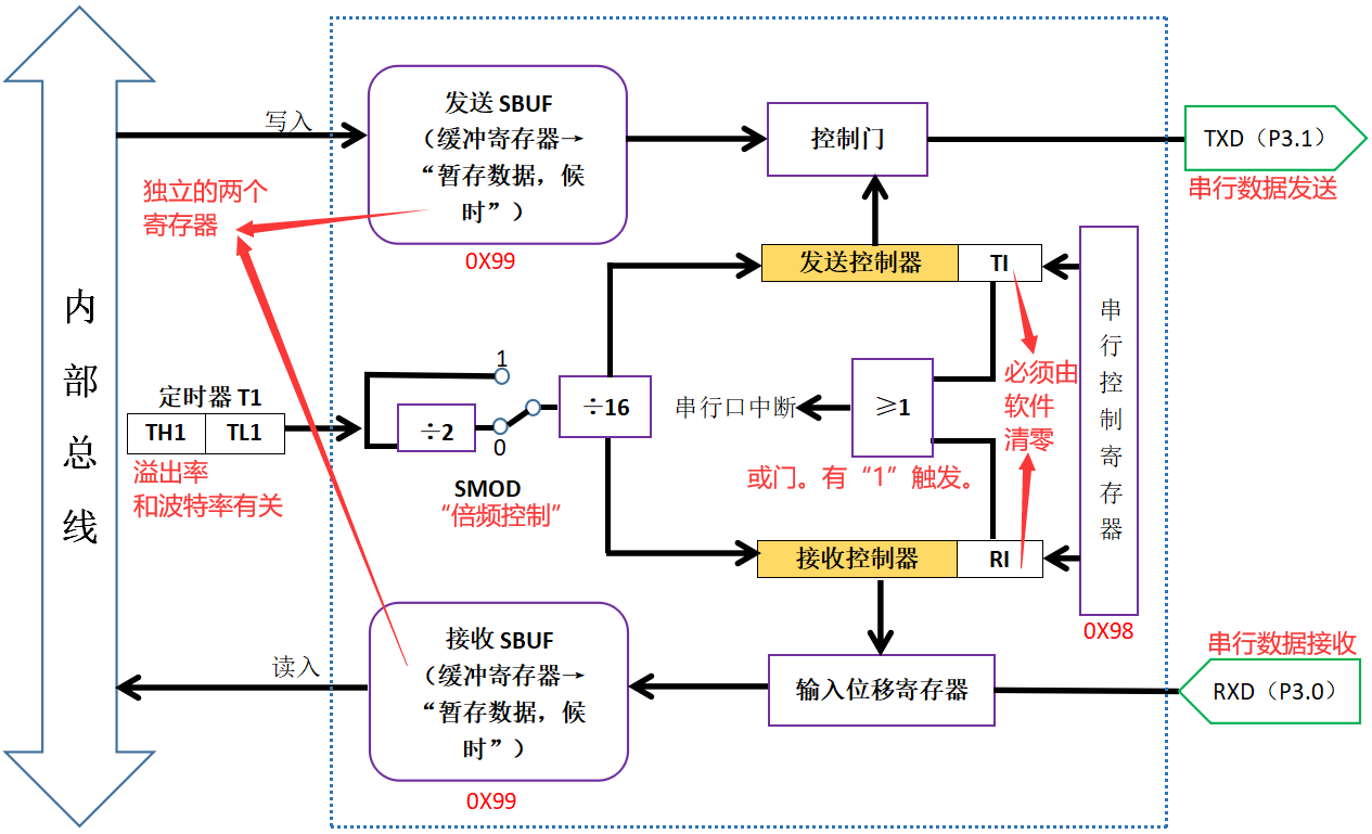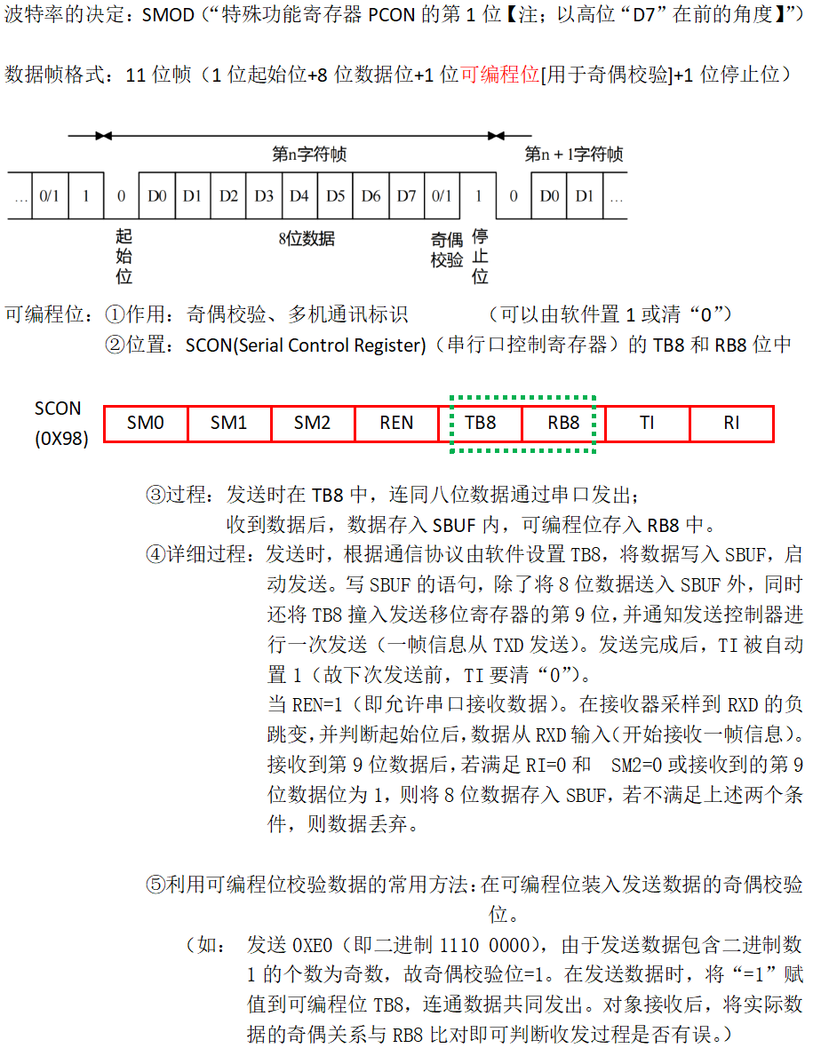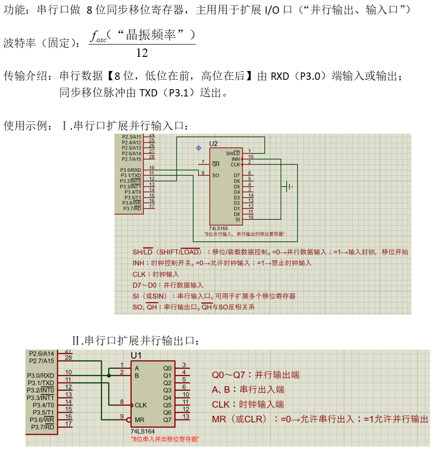 3.51单片机的串行接口: ?????????????????????????资源:内部集成1~2个可编程通用异步串行通信接口(UART),采用全双工制 ??????????????????????????????????????式。有四种工作方式,可通过软件编程设置为8位、10位和11位的帧格 ??????????????????????????????????????式,并能设置各种波特率。 ?????????????????????????串行口结构: ? ? ? ? ? ? ? ? ? ? ? ? ? ? ? ? ? ? ? ? ? ? ? ? ?????????????????????????设置工作方式(51单片机有四种工作方式,通过写串口控制寄存器来设置): ? ? ? ? ? ? ? ? ? ? ? ? ? ? ? ? (1)串行口控制寄存器SCON(Serial Control Register): ? ? ? ?? ? ? ? ? ? ? ? ? ? ? ? ? ? ? ?? ? ? ? ? ? ? ? ? ? ? ? ? ? ? ? ? ? ? (2)串行口工作方式: ? ? ? ? ? ? ? ? ? ? ? ? ? ? ? ? ? ? ? ? ? ? ? ?①方式0: ? ? ? ? ? ? ? ? ? ? ? ? ? ? ? ? ? ? ? ? ? ? ? ? ? ? ? ? ? ? ? ? ? ? ? ? ? ? ? ? ? ? ? ? ? ? ? ? ? ? ? ? ? ?? ? ? ????