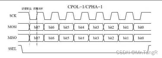 CPHA=1,就表示数据的输出是在一个时钟周期的第一个沿上,至于这个沿是上升沿还是下降沿,这要视CPOL的值而定,CPOL=1 那就是下降沿,反之就是上升沿。那么数据的采样自然就是在第二个沿上了。