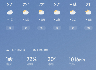 这是我手机上的天气预报,温度22摄氏度,湿度72%,压强1016hPa.?这两个的温湿度差不多的,压强不太一样。