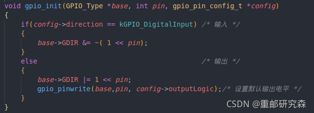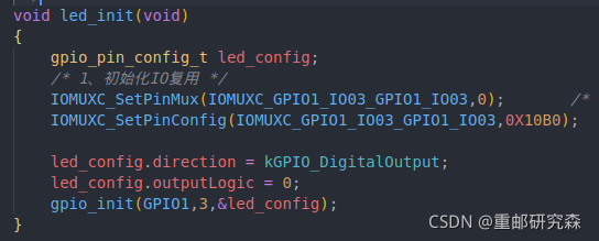 ?这是一个(led)GPIO初始化函数,包括输入参数举例(GPIO1,3,&led_config),表示初始化GPIO1的第三角,且初始化了led的结构体,通过这个结构体就可以进行初始化包括输入输出,高低电平。如下: