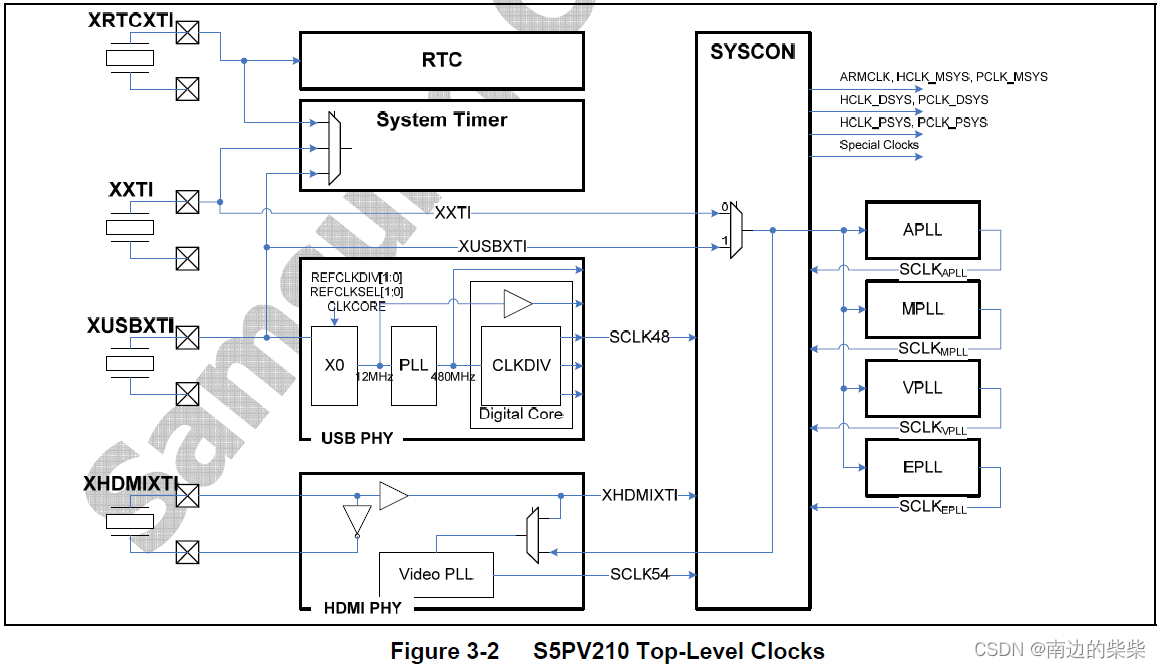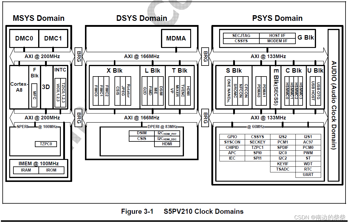 MSYS: CPU(Cortex-A8内核)、DRAM控制器(DMC0和DMC1)、IRAM&IROM······ DSYS: 都是和视频显示、编解码等有关的模块 PSYS: 和内部的各种外设时钟有关,譬如串口、SD接口、I2C、AC97、USB等。