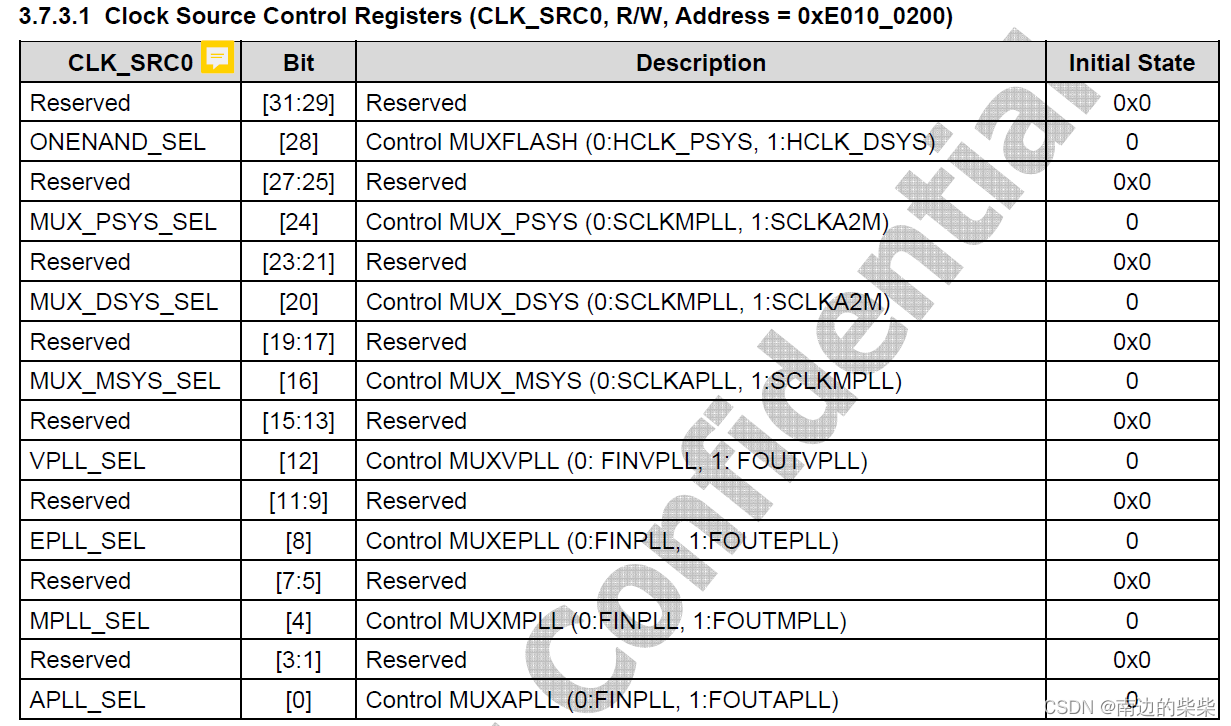 ????????禁用PLL,寄存器为CLK_SRC0,设置为0x0,可以绕过APLL,让外部24MHz时钟直接过去