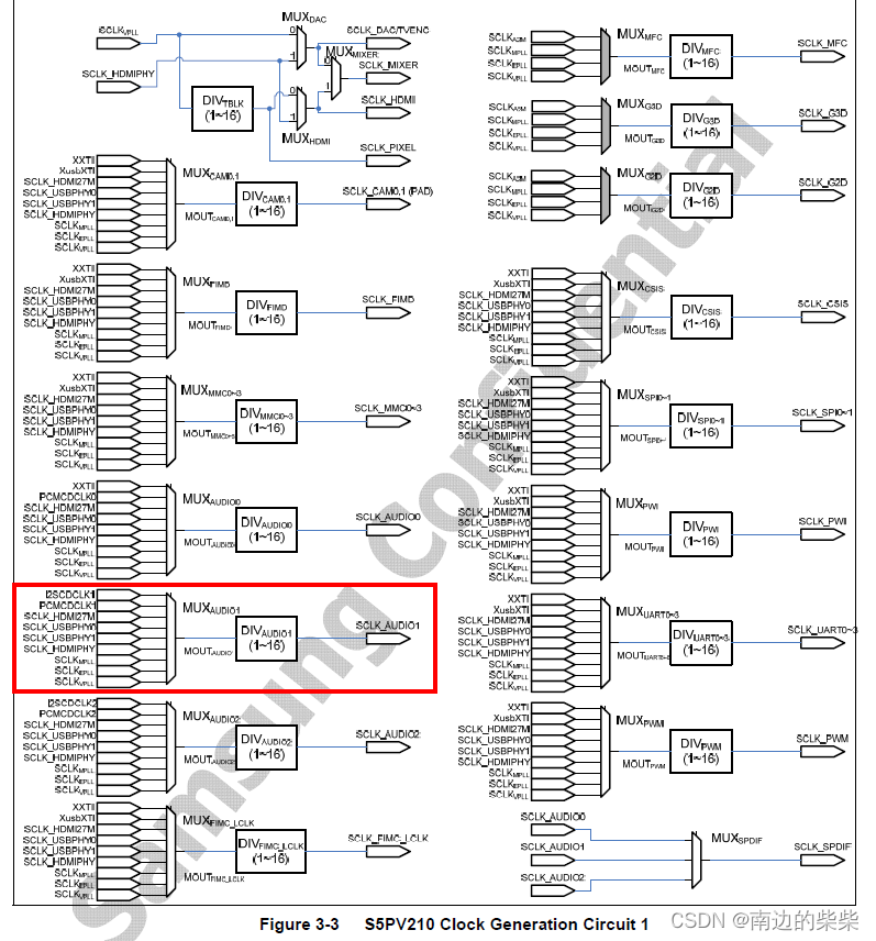 ????????因为SoC内部有很多部件都需要时钟,而且各自需要的时钟频率不同,没法统一供应。因此设计思路是PLL后先得到一个最高的频率(1GHz、1.2GHz),然后各外设都有自己的分频器再来分频得到自己想要的频率。
