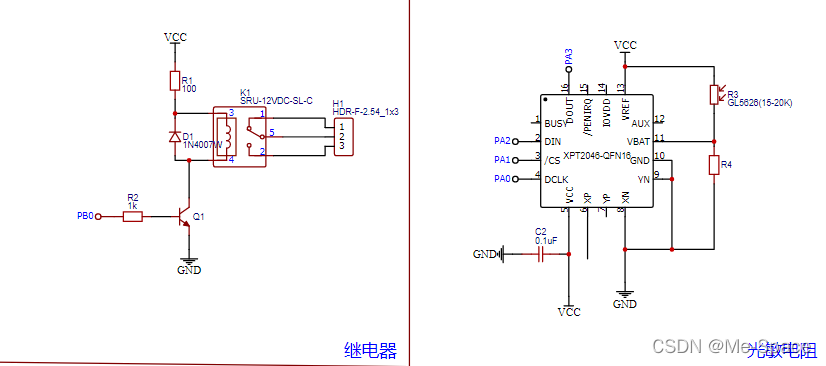 ????????本文是通过光敏电阻检测环境亮度,当亮度小于设定值时控制继电器打开,超过设定时关闭继电器。光敏电阻的数值转换是通过XP2046进行转换,使用STM32作为主控,用库函数进行编程实现功能。