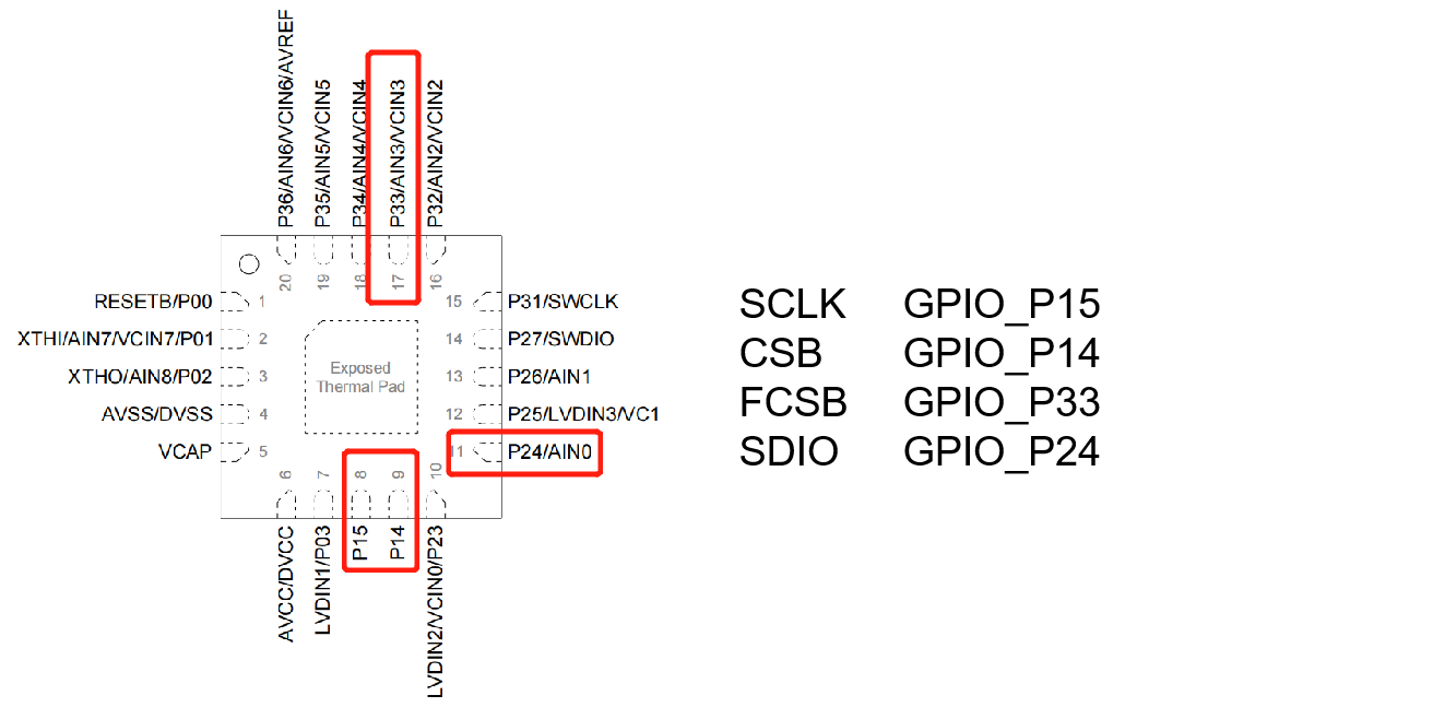 | CMT2300A | MCU | gpio复用功能 | | SCLK | gpio_p15 | 5 | | CSB | gpio_p14 | 5 | | FCSB | gpio_p33 | 0 | | SPI_MOSI | gpio_p24 | 5 | | SPI_MISO | gpio_p23 | 5 |