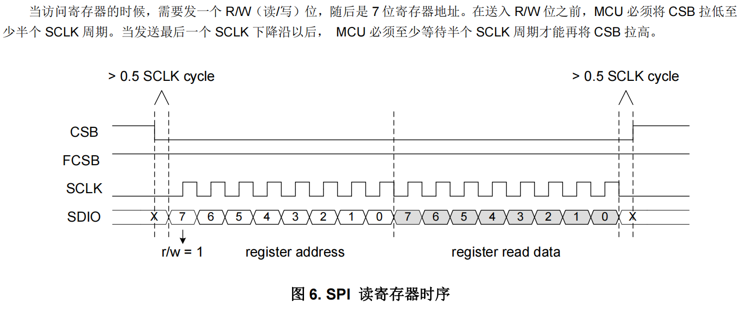 | SCLK | SPI的时钟 | | CSB | SPI访问寄存器的片选 | | FCSB | SP访问FIFO的片选 | | SDIO | SPI的数据输入和输出 |