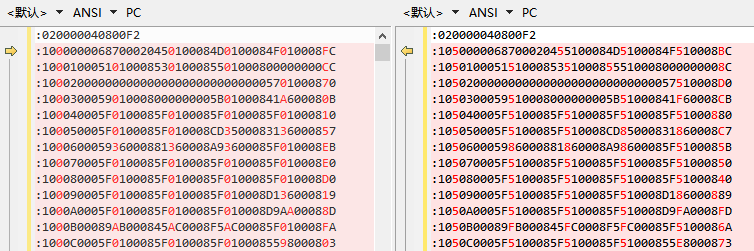 在Keil MDK中更改程序起始地址 0x8000000 -> 0x8005000 后, hex文件的地址变化如下: