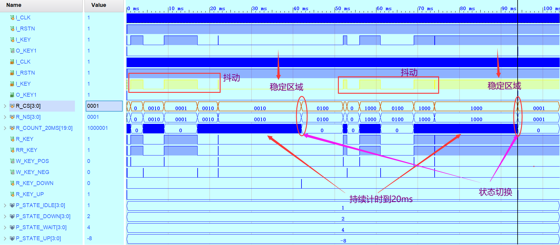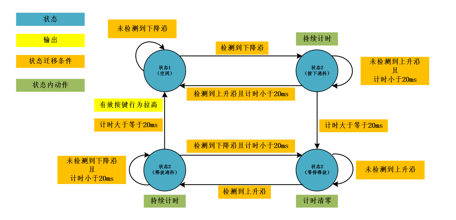 - 若计时时间大于等于20ms,进入状态 1,认为此时按键已经稳定释放;